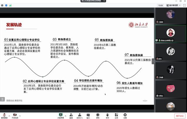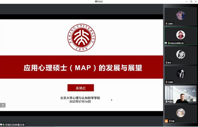 2022715-16日上午,我院应用心理硕士学位论文开题答辩在线上顺利开展。学院特邀北京大学元培学院党委书记、北京大学心理与认知科学学院副院长、教育部基础教育心理健康教育指导专委会副主任委员、博士生导师吴艳红教授作为本次论文开题答辩评审专家。开题结束后,吴教授为全体应用心理专业学生作了《应用心理硕士的发展展望与论文指导》专题讲座。本场讲座由学院副院长朱海东副教授主持,朱副院长代表学院对吴教授的到来表示感谢,并对吴教授在教学、科研及人才培养等方面的成果作了介绍。本次讲座由答辩委员会和参加开题答辩的23名研究生及即将入学的2022级全体应用心理研究生共同参与。