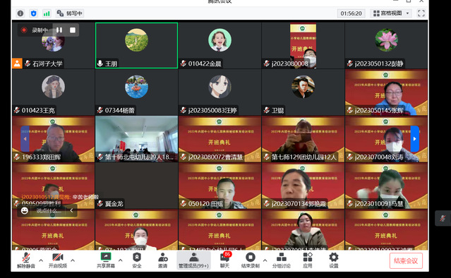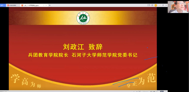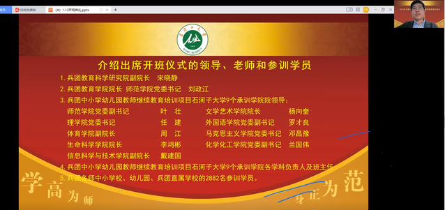 2023年1月12日,兵团中小学幼儿园教师继续教育培训项目开班仪式顺利举行。兵团教育科学研究院副院长宋晓静、兵团教育学院院长石河子大学师范学院党委书记刘政江、继续教育培训项目9所承训学院分管院领导、各学科负责人、班主任及2882名参训学员参加典礼。开班典礼由师范学院党委副书记叶壮主持。