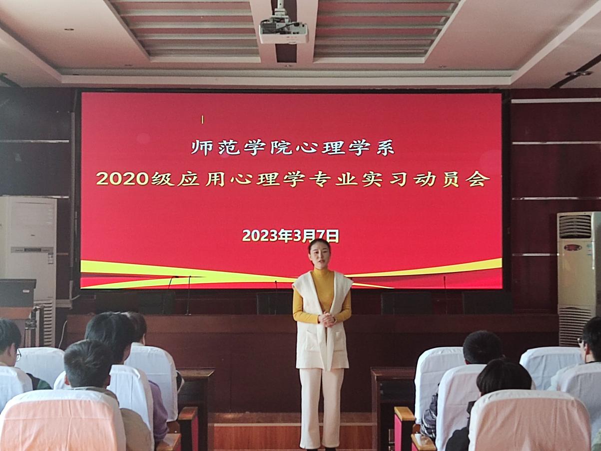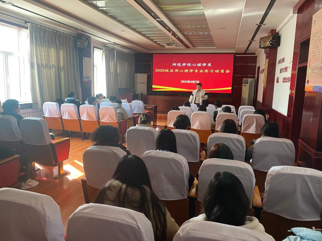 冰消雪融,大地回春,2020级大学生实习活动正式拉开帷幕。为了扎实做好应用心理学专业实习工作,引导学生明确认识实习的目的和意义,进一步提升学生对专业知识和技能的实践能力。2023年3月7日,心理学系在学院103学术报告厅召开了2020级应用心理学专业实习动员大会。参加本次动员大会的有心理学系主任毕爱红老师、副主任张烨老师及2020级应用心理专业全体学生。