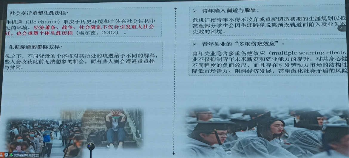 鲍老师指出由新冠疫情引起的社会变迁使得青年重塑生涯历程,呈现出升学替代就业、升学意愿冷却、失学失业三大表征,通过大量数据分析,对疫情前大一阶段初期生涯规划与疫情后毕业阶段实际生涯去向做了对比,提出高校学生生涯发展的“稳定型、调适型、脱轨型”三大生涯路径变化模式,并从三大路径阐述研究设计和研究假设的思路过程。