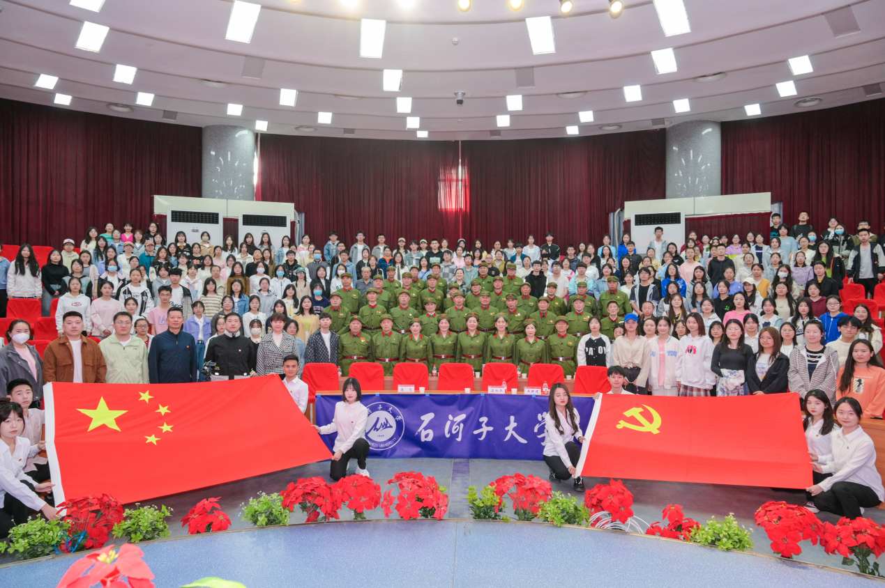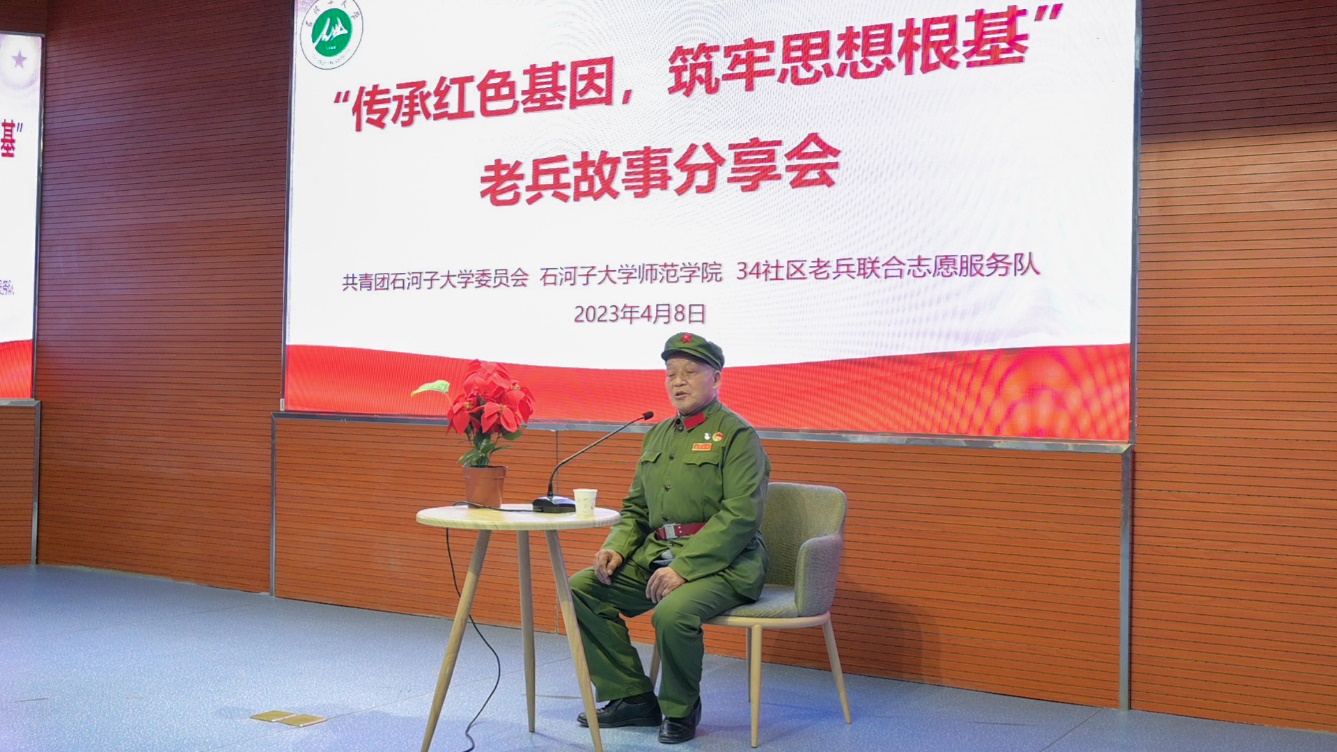 在党百年风云激荡、艰苦卓绝的奋斗史中,老兵是不可磨灭的一抹色彩。为深入学习宣传贯彻党的二十大精神,推进党史学习教育常态化、长效化,推动广大兵团青年深学细悟习近平新时代中国特色社会主义思想,增强争做新时代戍边人的思想自觉和行动自觉,2023年4月8日,石河子大学团委、师范学院联合34社区老兵联合志愿服务队于北区大会堂二楼学术报告厅共同举办了“传承红色基因 筑牢思想根基”老兵故事分享会。身经百战的36名老兵、师范学院党委副书记叶壮、师市退役军人事务局主任袁亮、红山街道退役军人服务站站长王新建、红山街道34社区党委书记梁红燕出席此次活动,我校近五百余名学生参加。