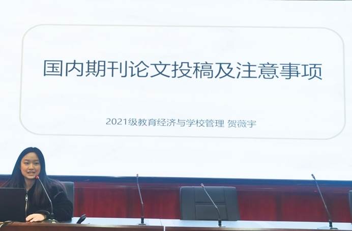 为营造研究生学术新氛围,活跃学术思想,创设学术交流、经验分享的平台,学院于5月7日16:00在师范楼103学术报告厅开展“研精覃思 笃学不倦”学术沙龙活动,主题为国内外期刊投稿经验分享。2021级教育学专业教育经济与学校管理研究方向的贺薇宇、心理健康教育研究方向的狄思雨做了分享,学院研分会学术部杨玉霞主持活动,本次沙龙有幸邀请到学院教育技术系主任张红艳教授、心理学系教师孙小蒙副教授为点评嘉宾,全院在校研究生参加。