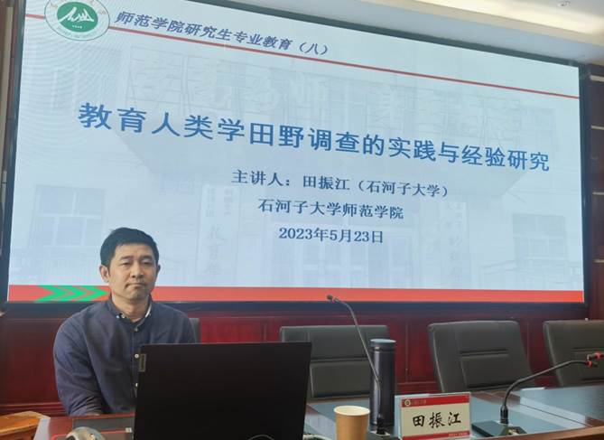 为提升研究生学术素养,筑牢学术根基,搭建跨学科学术交流的平台,5月23日10:00,学院研究生专业教育讲座在师范楼103学术报告厅举行。本次讲座有幸邀请南开大学社会学博士,石河子大学法学院田振江副教授,讲座主题为“教育人类学田野调查的实践与经验研究”。讲座由师范学院郭学军副教授主持,全院研究生积极参与。