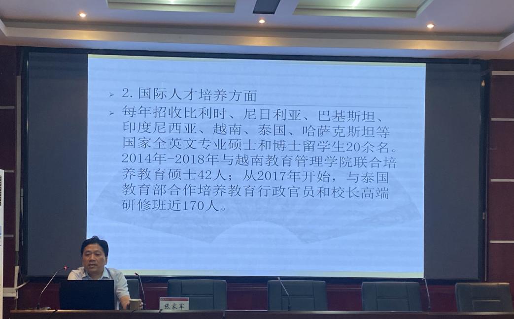 之后,张教授对教育学一流学科建设的成果作了展示。他特别提到在本科生人才培养方面设立的“晏阳初实验班”,培养的优秀本科生进入“双一流”大学读研率达到了90%,极大提高了本科生人才培养质量。一流学科建设中还介绍了“脱贫攻坚”“乡村振兴”“稳疆固边”等国家战略,研究成果受到了教育部的高度肯定。他们创建的“U-G-I-S”校地协同创新模式与12省市进行了联动,促进了区域和学校教育发展,开创了校地协同创新新模式,并创造了极大的协同经济效益,为学科建设添砖加瓦。