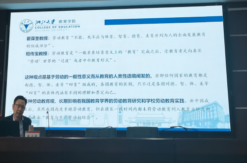 讲座伊始,张应强教授从立足教育看劳动和劳动教育揭示了两种通行的劳动教育观及其形成,主要说明劳动教育“从哪看”“怎么看”和“是什么”的问题,并列举了国内知名学者对于劳动教育的见解,说明了从不同的立足点出发,就有不同的劳动教育观。
