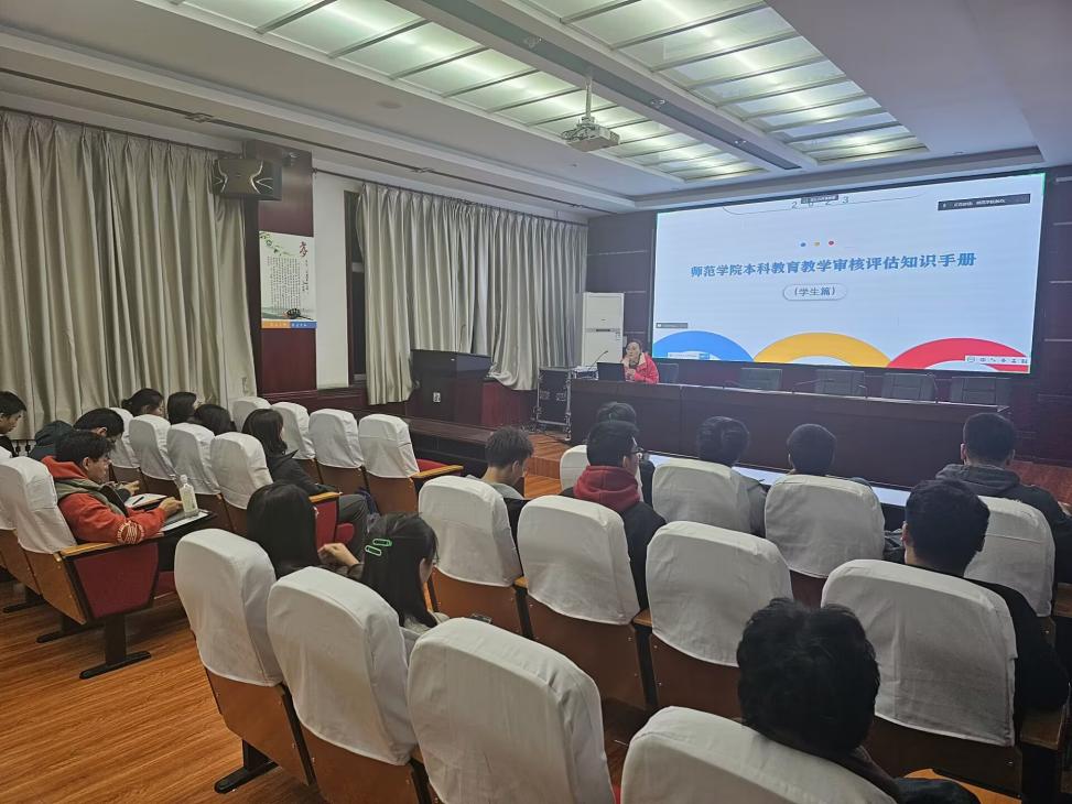 为深入理解新一轮本科教育教学审核评估核心要义和指标内涵,扎实做好学校审核评估工作,倡导师范生全员学习、全员参与;11月2日,师范学院教学管理办公室举行了新一轮本科教育教学审核评估学生应知应会培训,参会学生代表180余人,会议由教学管理办公室黄薇主任主持。