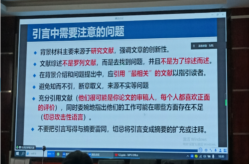 论文发表,质量是关键。孔风老师从论文的标题、摘要、引言、方法与结果、讨论五个部分对“好文章”进行了详细介绍,特别强调摘要与引言的规范性和新颖性问题,因为二者直接决定了审稿人是否有兴趣把论文读下去。孔风老师分别从列举反例、需要注意的问题、具体方法指导等方面进行阐述,为在座的师生明辨了论文修改方向。同时,孔风老师指出了反复修改的重要性,“文章不厌百回读,反复推敲佳文来”的格言令人深以为然。