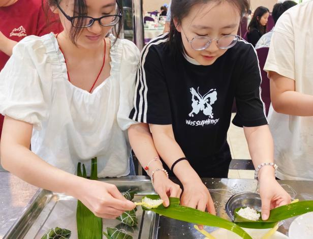 活动伊始,主持人梁宇芯和冯丽娜同学为大家讲解端午节的由来以及各地不同的节日习俗。他们重点介绍端午节挂艾草、佩香囊、吃粽子等传统习俗并通过视频向同学们教授包粽子的方法。随后同学们在老师的指导下,互相交流包粽子的技巧,尽情享受着亲手挽粽叶、塞粽馅的喜悦,切身感受了端午节浓浓的节日气氛,大家都纷纷表示今年的粽子定然“分外香甜。一片片清香粽叶,一粒粒晶莹糯米,在一双双巧手下转眼变成玲珑可爱、各具特色的诱人粽子。