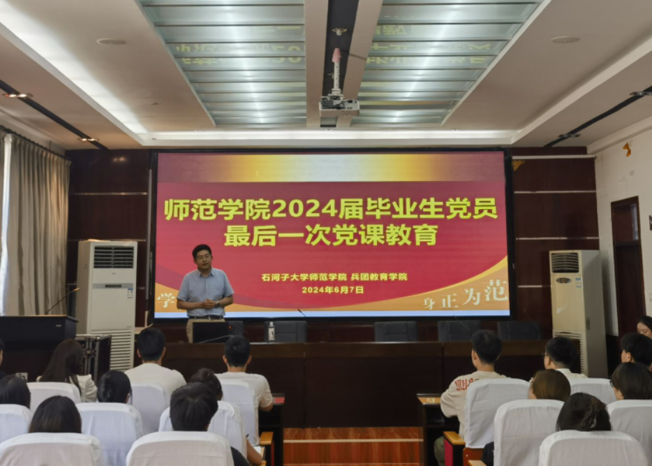 6月7日下午,学院党委副书记叶壮以“传承弘扬新时代的兵团精神”为题,在学院学术报告厅为2024届全体毕业生党员上了在校期间的最后一堂党课。叶壮老师结合学院的办学特色和毕业生实际,用生动的语言阐释了习近平总书记关于兵团精神动力重要论述的重大意义和价值内涵;用大量的资料和图片,介绍了当代兵团人为建设更强大更繁荣的兵团所倾注的智慧与汗水,分享了他通过大量实践调研所形成的对兵团迅猛发展势头的感悟。这堂党课,不仅使同学们再一次确立起亲近兵团、热爱新疆的思想认知,更深切的认识到前辈人赢得斗争的方法、使平淡人生发出光彩的方法,永远值得学习与传承。师范学子理应承载着这份精神动力,以更加饱满的热情、更加务实的担当、更加扎实的作风逐梦未来。