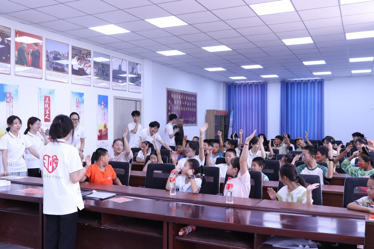 “红领巾为什么是红色的呢?”“因为革命先辈的鲜血染红了它。”在“红领巾”主题队日活动中,实践团成员通过“红领巾为什么是红色的”这个问题,启发学生思考,导入红色经典诵读活动。通过大带小、大合小,分年龄段、分角色朗读、朗诵等方式,《我爱你中国》《行走的界碑》《少年中国说(选段)》等经典读物,在稚嫩清脆的齐颂声中,久久回荡在活动室上方。爱国是中国人永远的底色,坚定爱党爱国情怀,根植理想信念,是“五彩”课堂的出发点与落脚点。