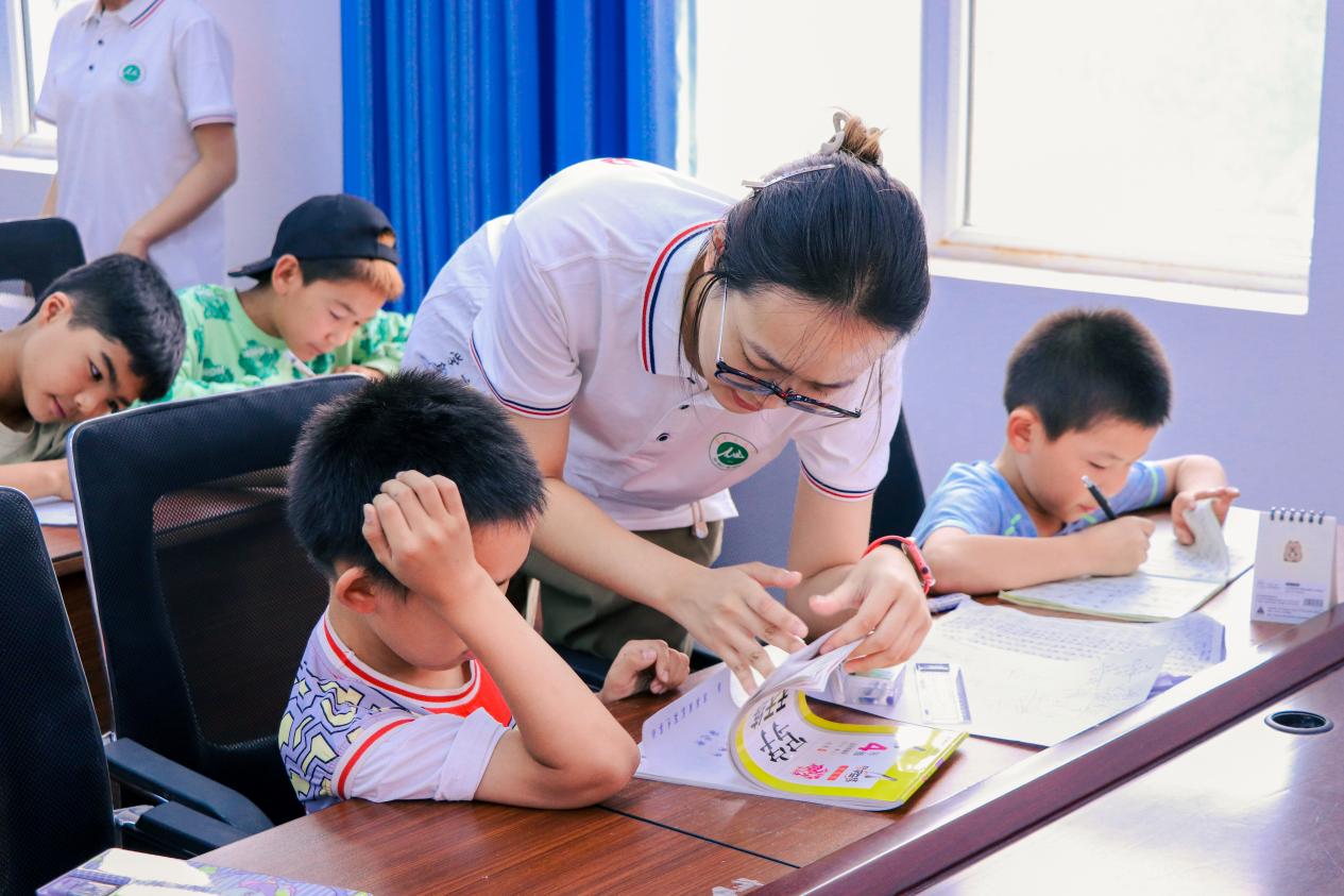 在“五彩”课堂中,实践团成员发掘自身专业优势和兴趣特长,开设书法课堂,带领学生们感受中华优秀传统文化的魅力。书法课上,大手握小手,孩子们认真学习毛笔的握笔姿势,横平竖直、点提撇捺,成员们细心示范,做到“字”“法”并见,田字格内是学生们青涩的大字,在孩子们心中也根植下了“方方正正写字、堂堂正正做人”的意识。以中华优秀传统文化开辟推普新路径,为坚定文化自信,进一步推进文化润疆工程增添亮色。