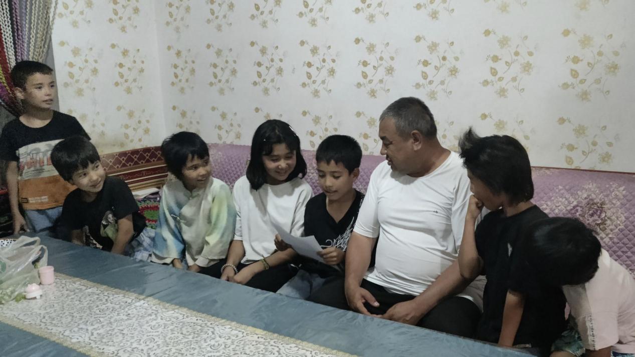 在十四师二二四团九连、十连开设的推普课堂增设了亲子共学环节,通过家校合作激发学习兴趣,加强家庭成员之间的情感交流。12岁维吾尔族小女孩祖丽皮努尔·巴克尔在小手拉大手比赛活动中,和家人获得了一等奖,她开心的和实践团成员分享:“每天下课之后,我就是爸爸妈妈的小老师,带着爸爸妈妈重读当天的学习内容,这种感觉真是太棒了。”