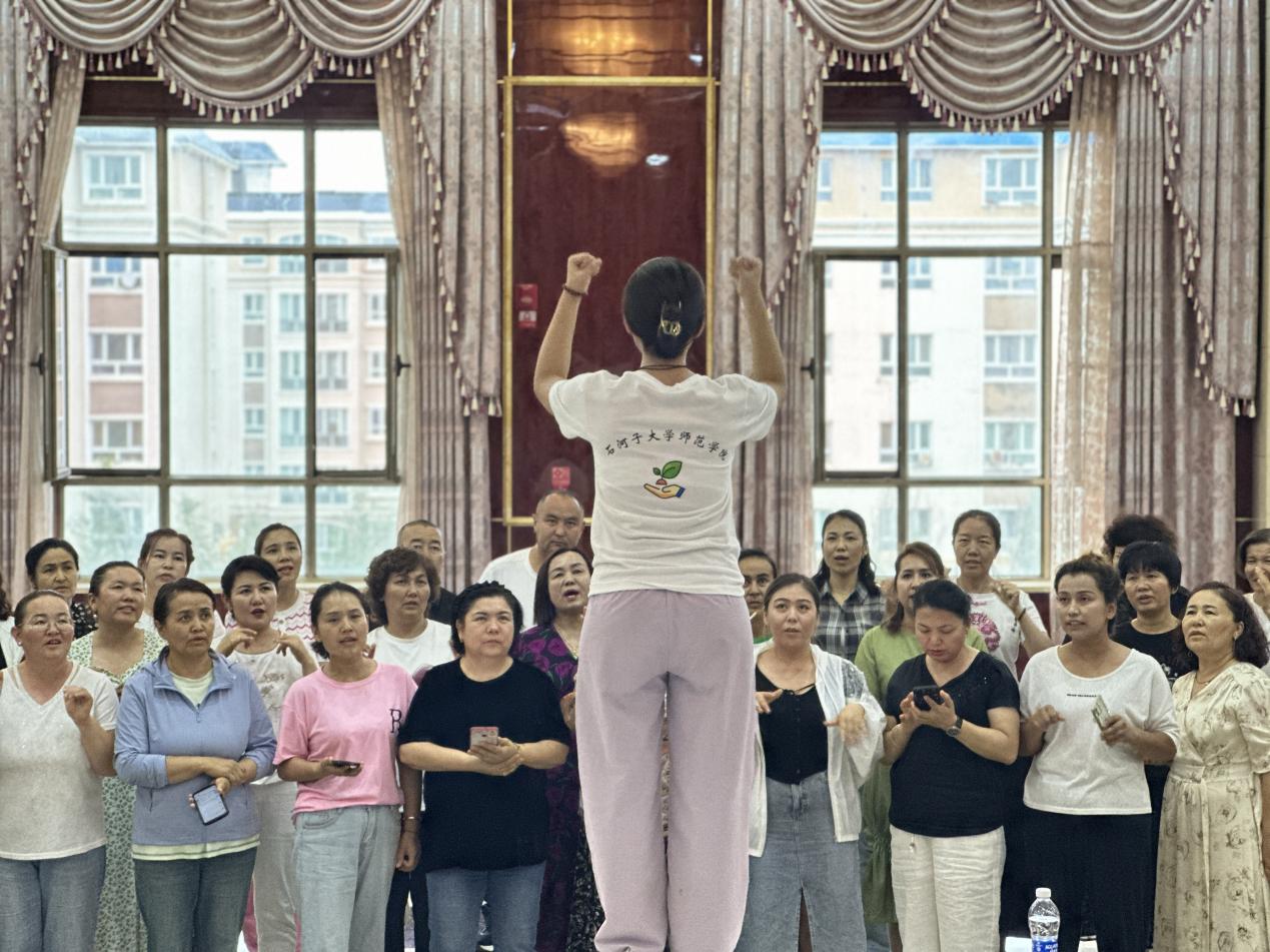 一支由石河子大学师范学院学前教育专业的11名硕士研究生组成的实践团来到新疆昌吉回族自治州木垒哈萨克自治县迎宾社区,实践团在实践期间灵活安排培训时间、保障培训质量,针对当地的120名少数民族幼儿教师开展国家通用语言文字推广普及培训,采用混合研究范式深入探究幼儿教师国家通用语言文字能力现状及影响因素,打破沟通界限,促进文化共融,进一步铸牢中华民族共同体意识。
