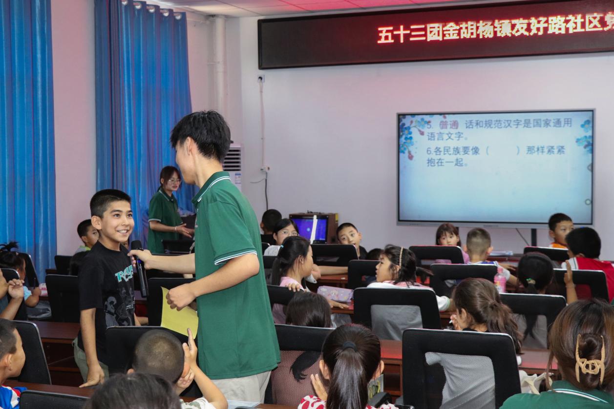 “小苏老师,你今天给我们示范的方言沟通交流,我才知道‘吃饭’这个词原来有这么多的说法,如果我们都用方言沟通,好困难呀,我都听不懂,说好普通话真的很重要。”11岁汉族小女孩何玉娜说道。这是在新疆生产建设兵团第二师二十四团的振兴社区推普课堂上发生的一幕,实践团成员利用他们宣讲特长,用接地气的语言,讲出大大的道理。
