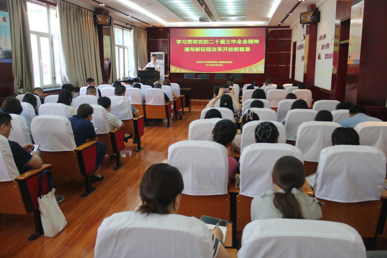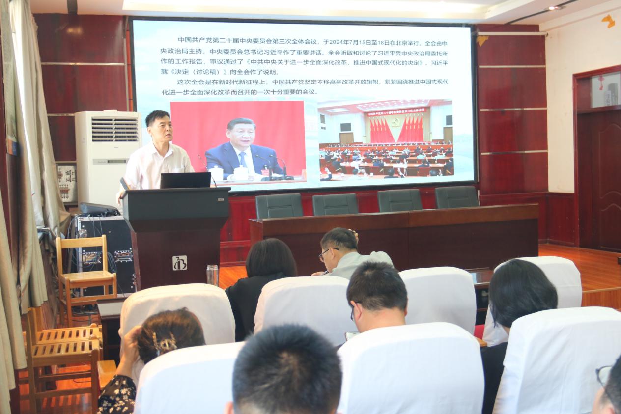 会上,郝朝晖书记以“深入学习贯彻党的二十届三中全会精神,谱写新征程改革开放的新篇章”为题作了专题党课讲座。对党的二十届三中全会的主题、《中共中央关于进一步全面深化改革、推进中国式现代化的决定》的基本框架、进一步全面深化改革的主题、总目标、重大原则和党的二十届三中全会对进一步全面深化改革做出的系统部署等方面做了全面解读。特别是结合学院高质量发展,就“构建支持全面创新体制机制”,统筹推进教育科技人才体制机制一体改革,深化教育综合改革方面进行了重点学习。对《中共中央国务院关于弘扬教育家精神加强新时代高素质专业化教师队伍建设的意见》开展了学习。