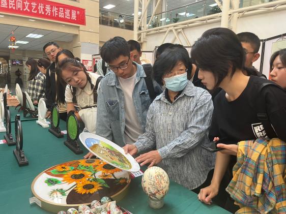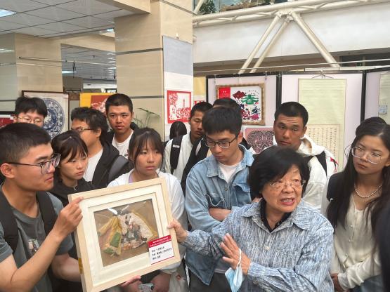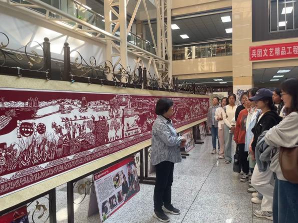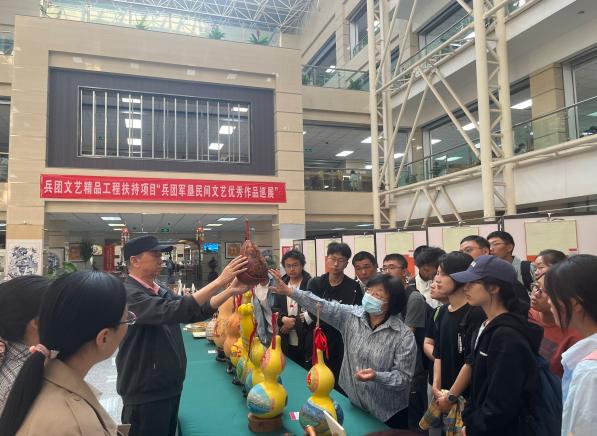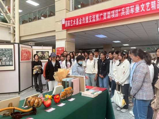 薛洁教授的讲解指导以“兵团军垦民间文艺优秀作品巡展” 为契机,达到了“以美育人”的效果。作品以兵团军垦为主题,涵盖民间文学、民间艺术、民俗文化等多种文艺形式,是民间艺术精品的汇聚。这些作品既呈现了多姿多彩的兵团文化,又展示了民间艺人的高超技艺。作品主题鲜明,构思巧妙,全面展现出兵团人艰苦奋斗、无私奉献、积极向上的生活面貌与精神风貌,是具有浓郁兵团元素的佳作,更是让师生感受兵团精神、了解兵团文化的重要载体。