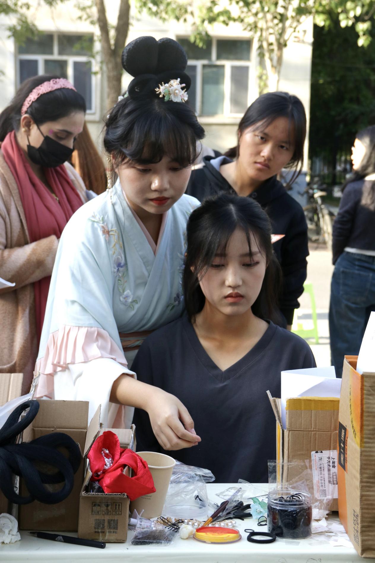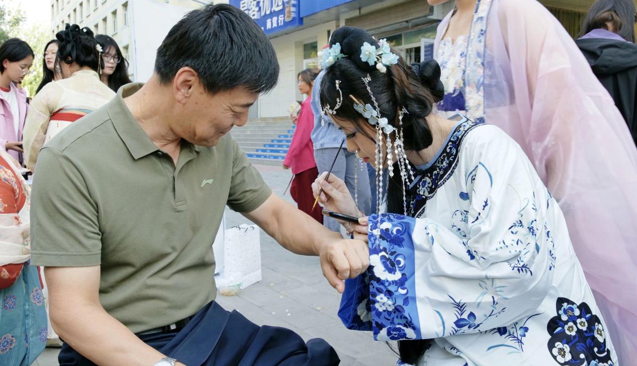 汉服妆造区,水月汉韵汉服社的同学们身着各式汉服,精致的妆容与华丽的服饰相得益彰,展现出汉服文化的独特魅力。他们或轻盈漫步,或翩翩起舞,让在场的师生们仿佛穿越回了千年前的盛世繁华。