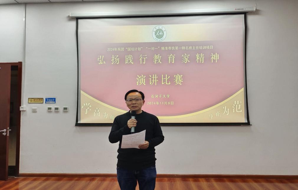 为深入学习贯彻党的二十届三中全会和习近平总书记在全国教育大会上的重要讲话精神,贯彻落实《中共中央国务院关于弘扬教育家精神,加强新时代高素质专业化教师队伍建设的意见》部署要求,引导广大教师践行以教育家精神为核心的教师群体共同价值追求,11月8日晚,兵团教育学院、师范学院举办“弘扬践行教育家精神 ”主题演讲比赛,2024年兵团“ 国培计划”“一对一”精准帮扶第一师名班主任培训项目的全体参训教师参加活动,兵团教育学院院长童德军、项目首席专家马萍老师及团队出席活动。