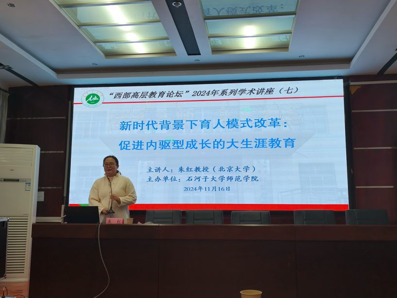 为开阔学院师生学术视野,营造良好的学术氛围,学院于11月16日在师范学院一楼学术报告厅开展“西部教育论坛”2024年第七场学术讲座——“新时代背景下育人模式改革:促进内驱型成长的大生涯教育”。本次讲座特邀北京大学教育学院朱红教授主讲,学院副院长朱海东教授主持。