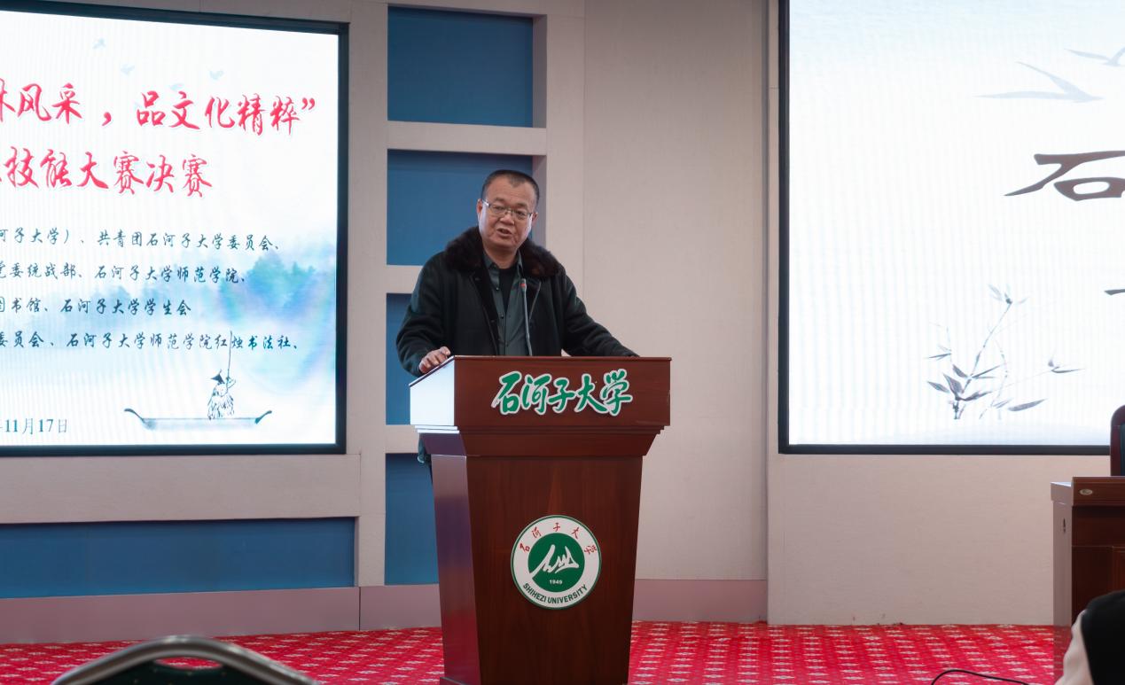 2024年11月17日,石河子大学“展墨林风采 品文化精粹”三笔字专业技能大赛决赛在图书馆五楼报告厅举行。大赛邀请到中国书法家协会会员、兵团书法家协会副主席、石河子大学文联副主席王怡平,石河子市书法教学专业委员会副理事长、师范学院红烛书法社指导教师张泉等专家担任评委,教务处、统战部、团委、师范学院、图书馆的领导作为嘉宾出席大赛。