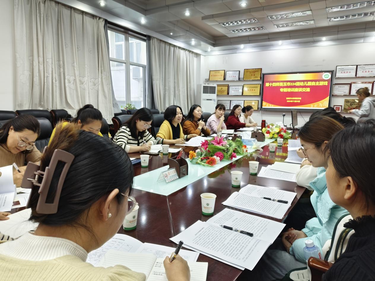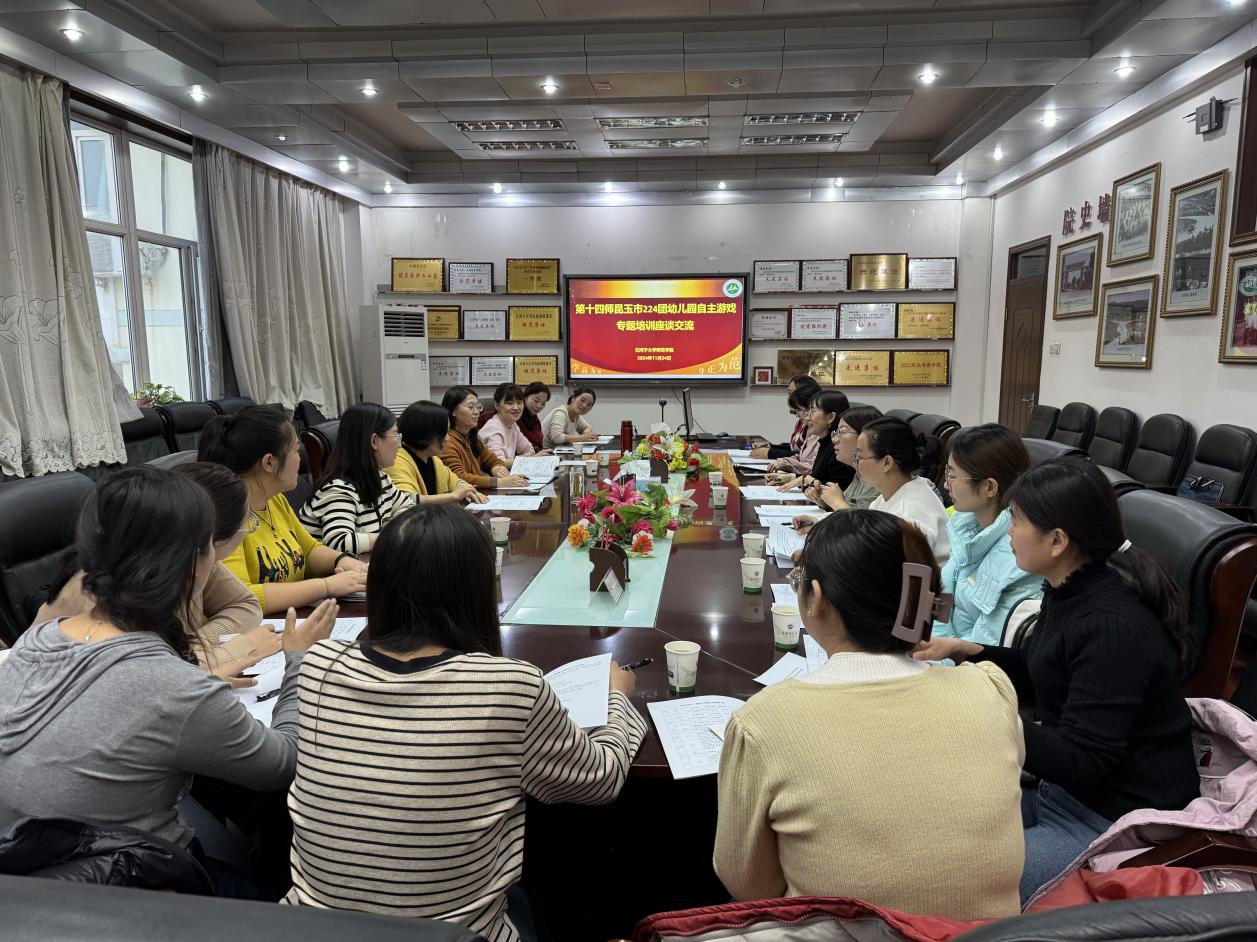 11月24日,师范学院精准帮扶第十四师昆玉市224团幼儿园自主游戏专题培训在四楼会议室开展。此次培训聚焦提升昆玉市幼儿园教师专业素养,力促自主游戏在幼教领域的深度实践与创新发展。师范学院副院长方建华、学前教育教研室主任李攀、石河子市实验幼儿园副园长钱丹丹、石河子市第二幼儿园副园长于庆娟及14名224团的幼儿园教师共同参与。