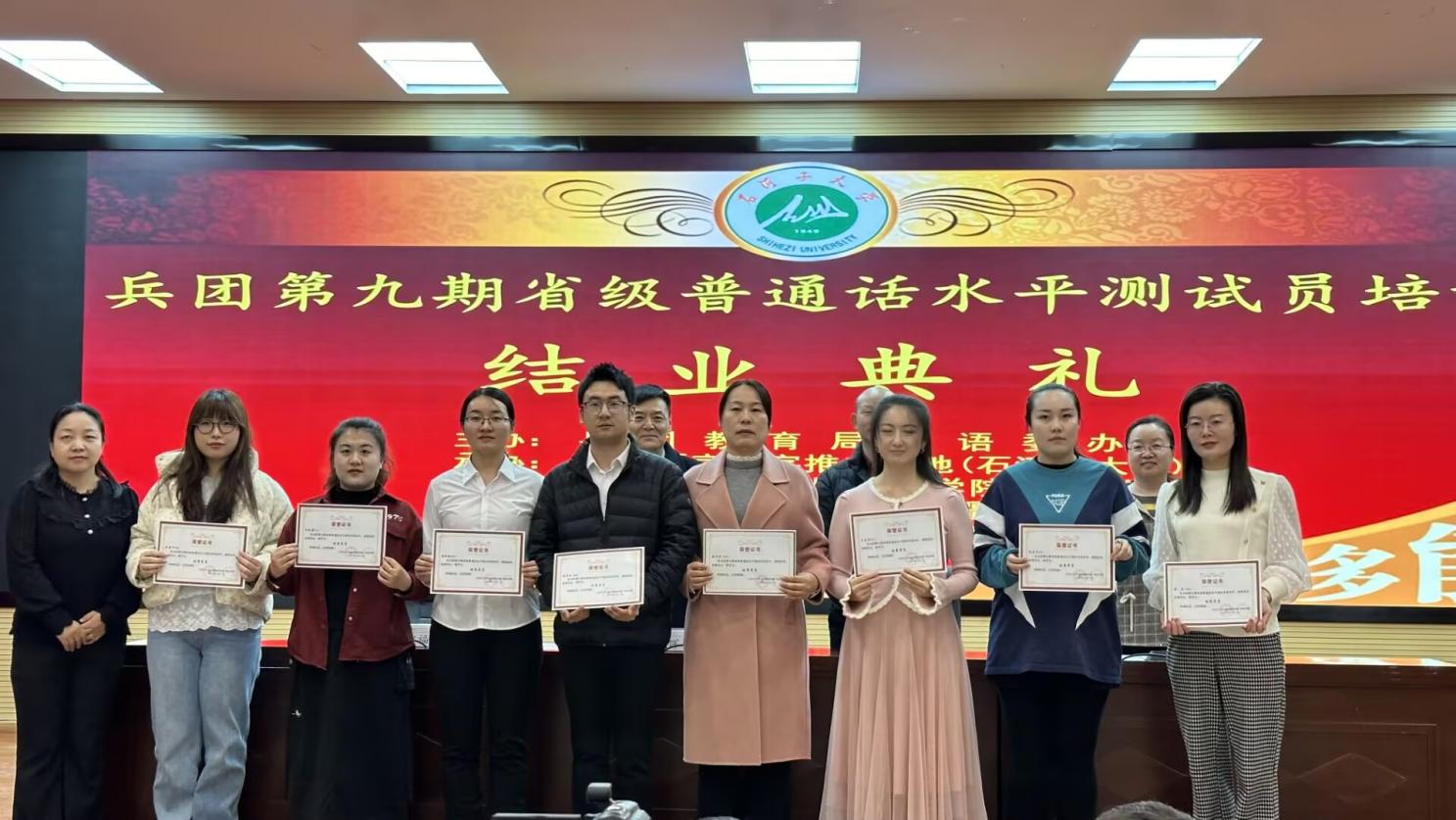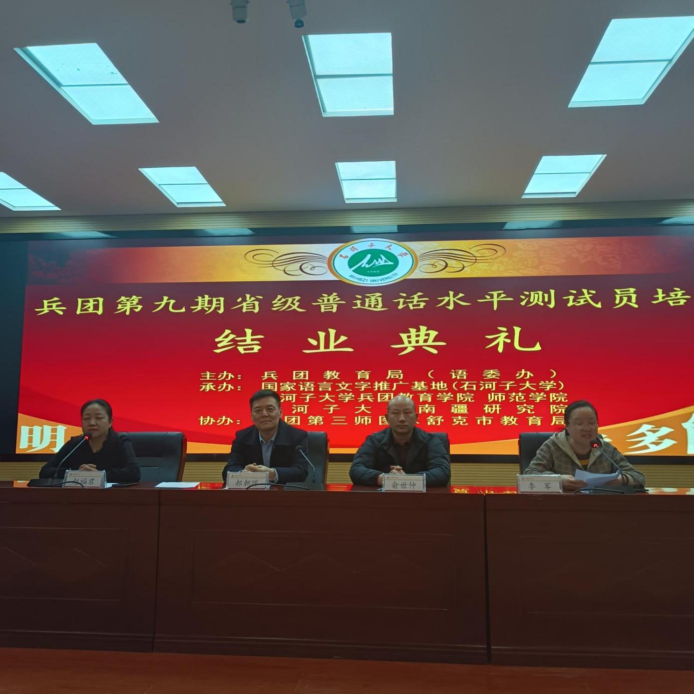 3月7日下午,由兵团教育局(语委办)主办、我校承办的兵团第九期省级普通话水平测试员培训在石河子大学南疆研究院圆满结业,师范学院党委书记、兵团教育学院党总支书记郝朝晖、南疆研究院院长俞世仲以及授课专家参加结业典礼,培训项目执行负责人赵福君主持。