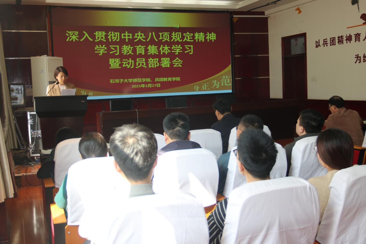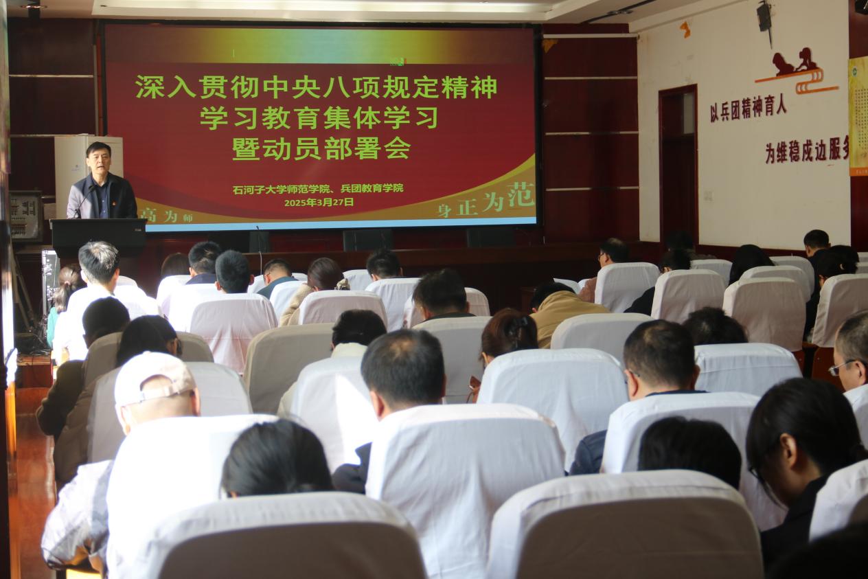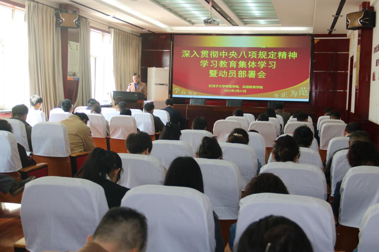 会上,院长韩玺英传达了中共中央办公厅印发的《关于在全党开展深入贯彻中央八项规定精神学习教育的通知》以及中央党的建设工作领导小组会议精神。兵团教育学院院长童德军传达了自治区党委党的建设工作领导小组会议、兵团党委党的建设工作领导小组会议和石河子大学深入贯彻中央八项规定精神学习教育动员部署会精神,让全体师生清晰了解上级部门对于此次学习教育的重视程度与具体要求,明确学院开展相关工作的背景与方向。
