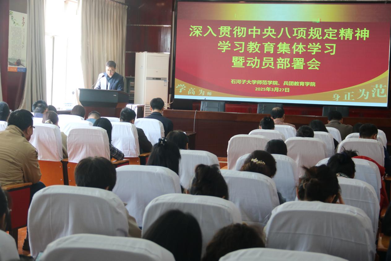2025年3月27日上午,师范学院党委召开深入贯彻中央八项规定精神学习教育动员部署会,传达中央及上级党委会议精神,部署全院学习教育工作。学院领导班子、全体师生党员参会,会议由党委书记郝朝晖主持,并作动员讲话,强调以“严实作风”推动学习教育走深走实。