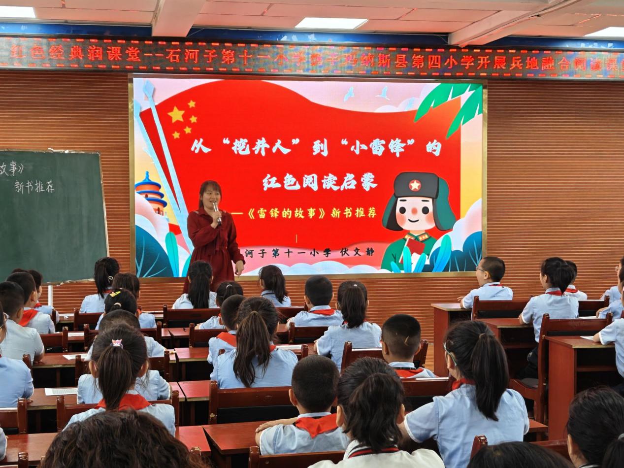 校园内洋溢着朗朗书声,浓郁的文化氛围和蓬勃的育人气象迎面而来。在“兵地书香共传承,红色经典润课堂”兵地融合阅读课堂教学展示活动中,由第十一小学的伏文静老师主讲《雷锋的故事》,巧妙地以“吃水不忘挖井人”为引,深入阐释了雷锋精神,引导学生通过观察插图、品味语言、解读标题和联系实际四个环节深入体验红色经典的内涵;玛纳斯县第四小学的史清健老师主讲《闪闪的红星》,以一颗红星为主题线索,向学生们传授了如何联系上下文、做批注、跳读等阅读技巧。课堂上,小学生们积极踊跃地举手发言,稚嫩却坚定的声音,传递出对红色精神的深刻理解,使在场的师范生们深刻感受到了教育唤醒生命的强大力量。