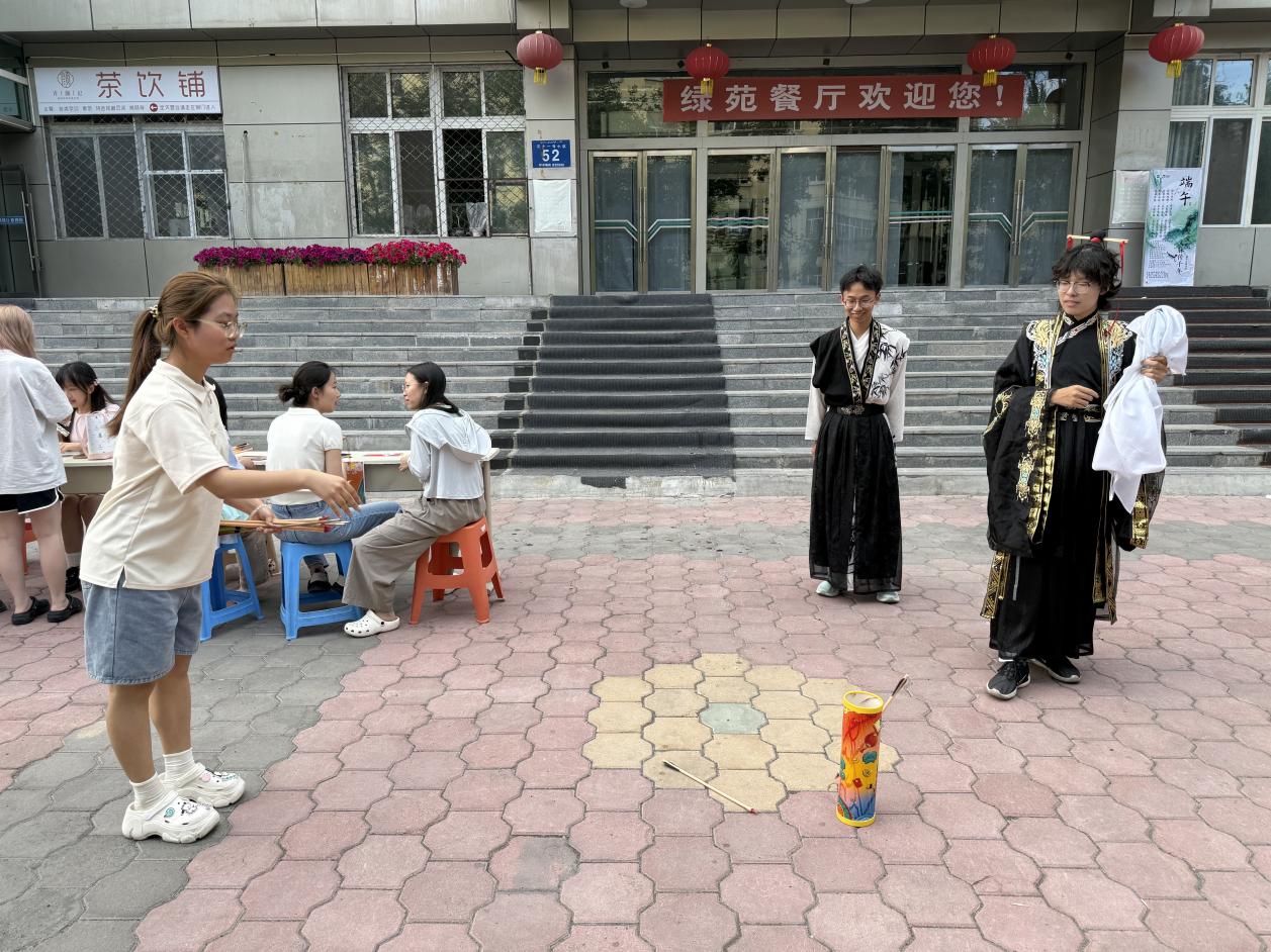 活动现场热闹非凡,丰富多彩的项目吸引了众多师生参与。在投壶区域,同学们化身古时雅士,手持箭矢,专注投入地向壶中投去。每一次投中,都能引发周围人群的阵阵喝彩,在这充满趣味与挑战的活动里,大家亲身体验到古代传统礼仪游戏的魅力,感受古人休闲娱乐的雅致。