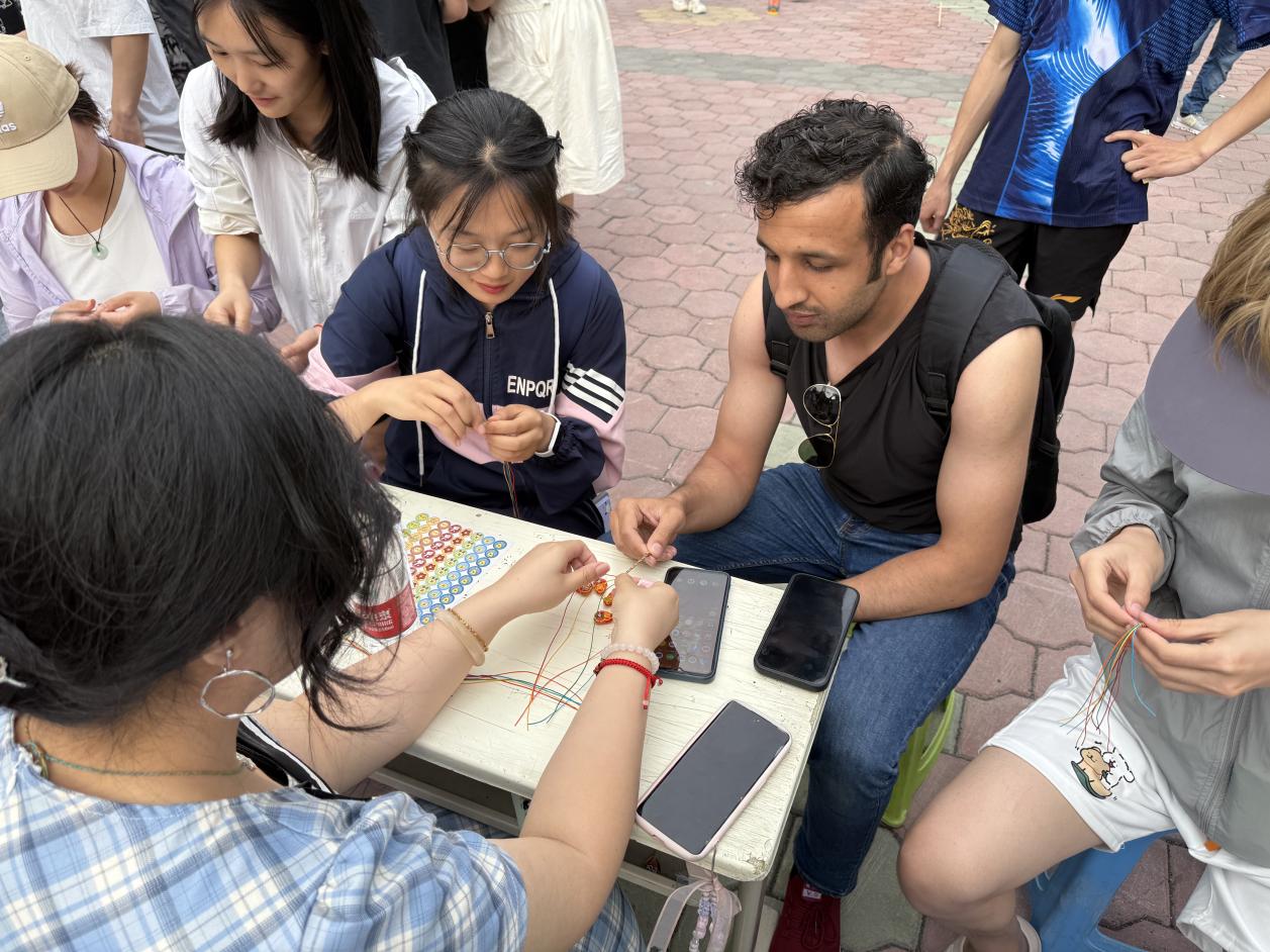 五彩绳制作区域,色彩斑斓的丝线整齐摆放。同学们在社团成员的指导下,精心编织。不一会儿,一根根寓意着祈福纳祥的五彩绳在手中诞生。大家相互展示成果,将这份端午特有的美好祝福系于手腕,为节日增添了一抹绚丽色彩。