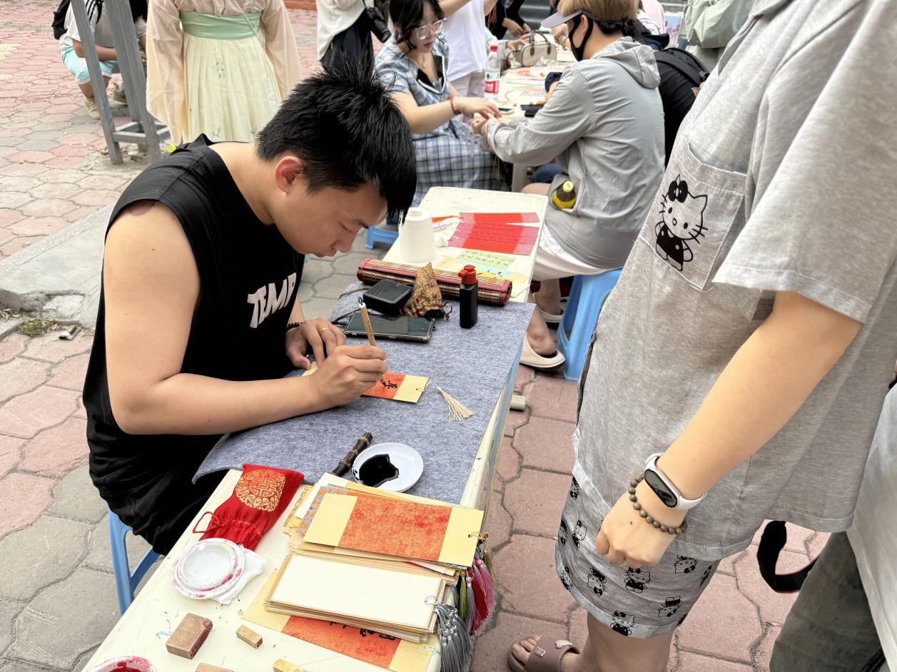此次活动还特别邀请了红烛书法社的同学。他们挥毫泼墨,为参与活动的同学书写精美的流苏书签。精心制作的书签,配上或刚劲有力、或飘逸洒脱的字迹,成为兼具实用价值与艺术美感的纪念品。拿到书签的同学爱不释手,这小小的书签,承载着书法艺术之美,也传递着中华优秀传统文化的韵味。