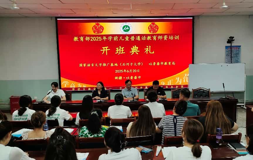 6月20日,由国家语言文字推广基地(石河子大学)实施的教育部2025年学前儿童普通话教育师资培训项目在吐鲁番市开班。兵团教育学院院长童德军、吐鲁番市教育局副局长王春涛及我校专家团队、推普助力乡村振兴研究生社会实践团队、100名参训教师参加开班典礼。