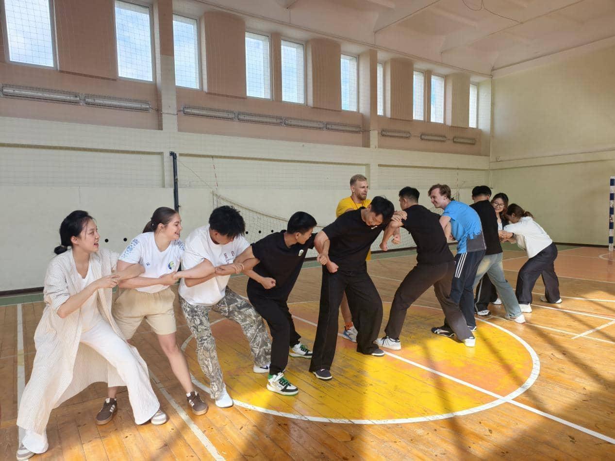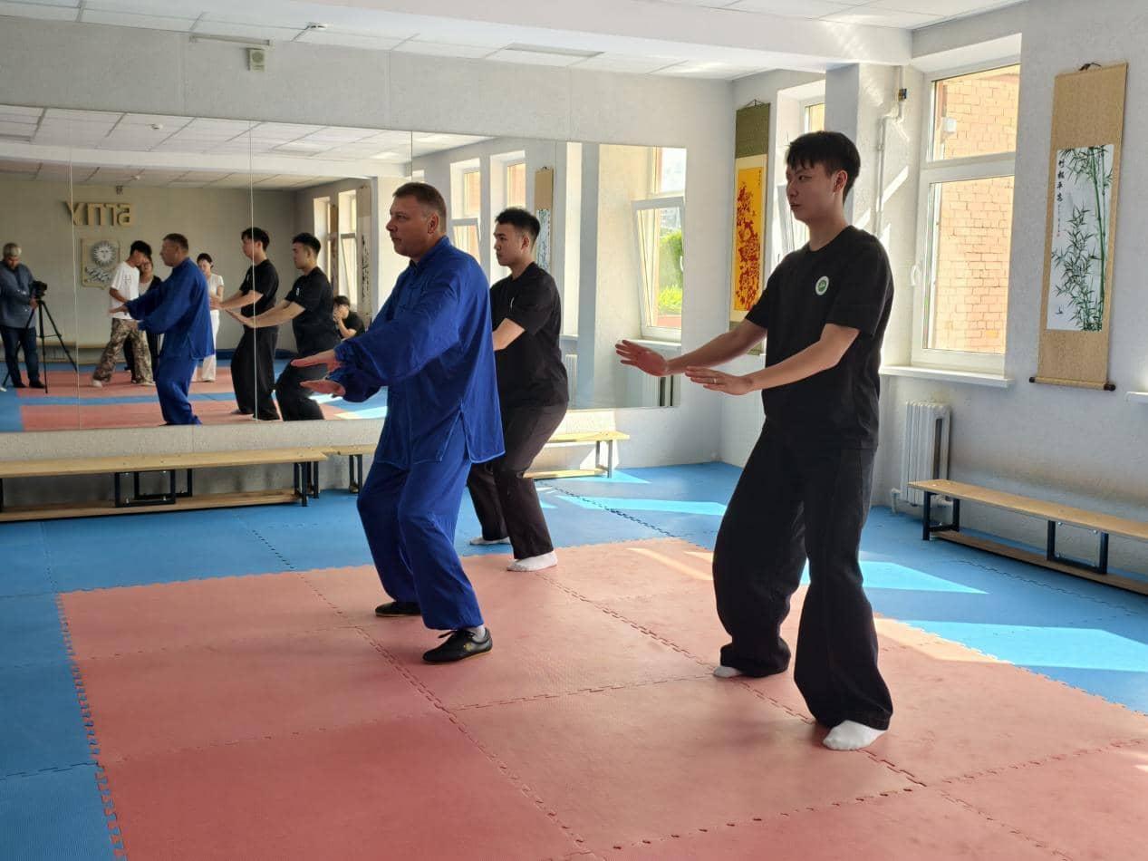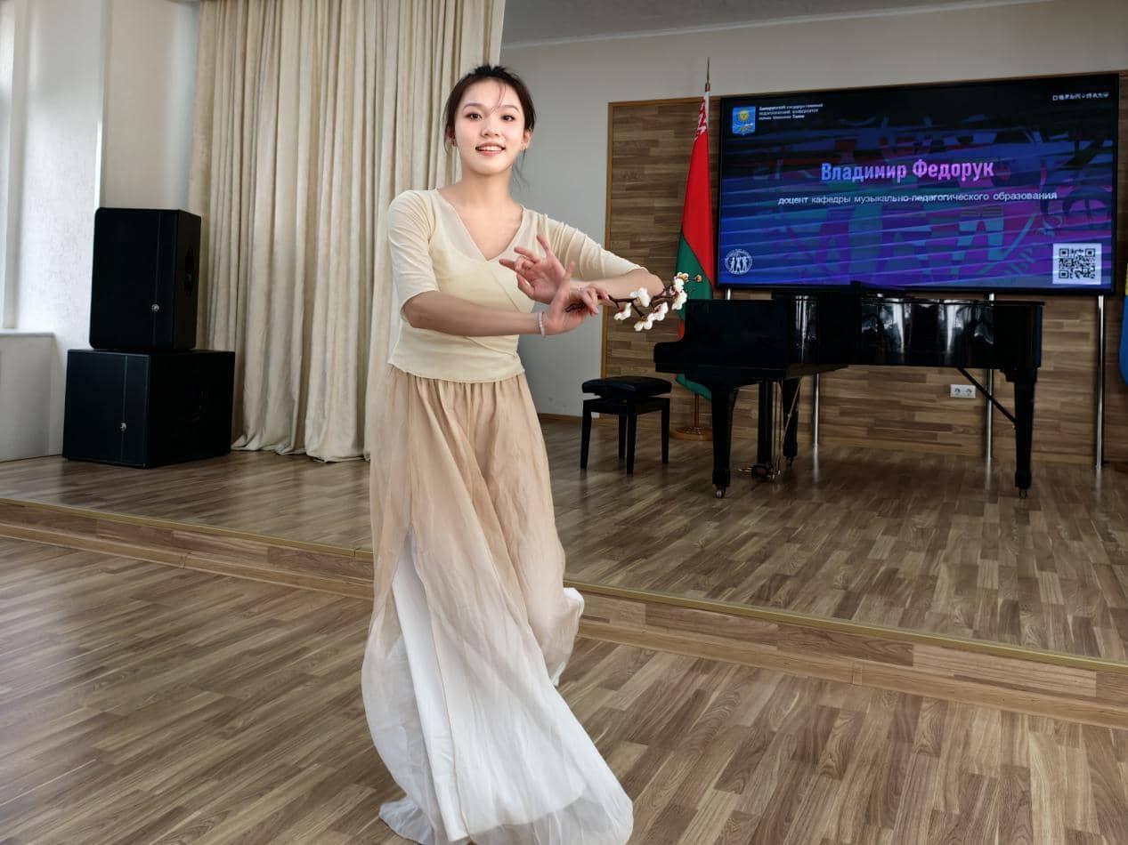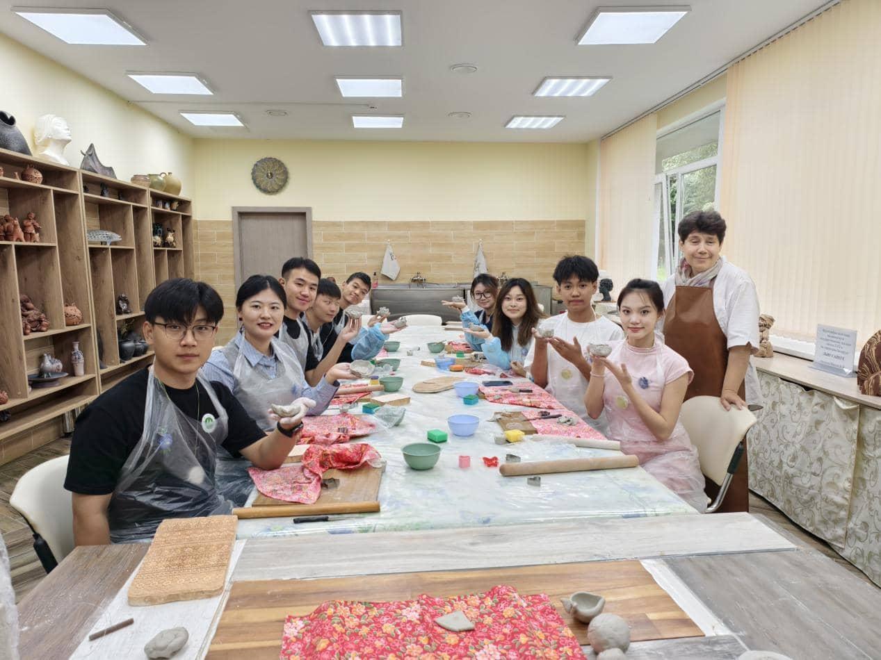 在白俄罗斯国立师范大学,师生们先后走进学前教育、基础教育、体育教育及美育四个学系,系统体验其“全人教育”理念与实践。学前教育系通过手工编织、传统织机操作与本偶戏等课程,展现“寓教于乐”的启蒙智慧。师范学院学前教育专业杨一萱同学感慨:“教育的起点不是课本,而是对每一个童真心灵的看见与尊重。”基础教育系将编程、机器人等现代课程,与俄语书法、玩偶剧等传统文化体验相融合,构建“理论—实践—创新”一体化路径。在体育教育系,中白师生共同展示二十四式太极拳、参与传统团队运动。体育学院体育教育专业谢玺昊同学认为:“体育课传递出身体素养与综合素质的统一,教育若能以趣味为舟、以文化为桥,就能让每个学生的个性之花绽放。”最后一站美育系以传统歌舞热烈迎宾,双方学生开展民乐合奏、即兴舞蹈等艺术对话。贯穿各系的是白俄罗斯教育中对文化传承与创新融合的重视。石河子大学师生在亲手实践、坦诚交流和思想碰撞中,不仅拓宽了教育视野,也更深刻理解了两国教育理念的互补与共鸣。这一系列跨系参访,既是一次扎实的海外专业研修,更是一堂生动的中白教育互鉴课。