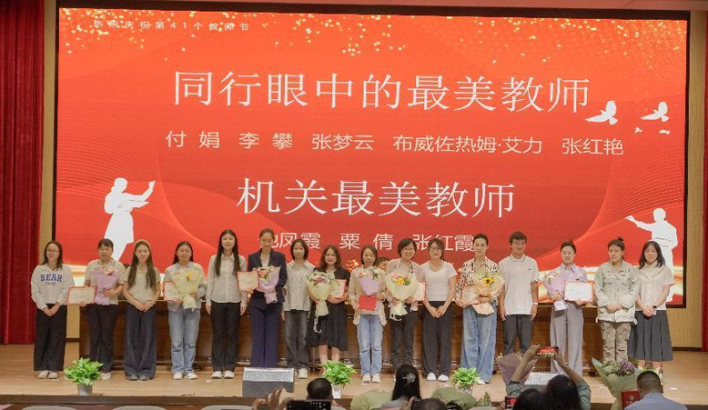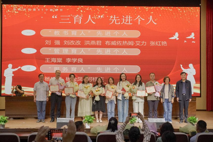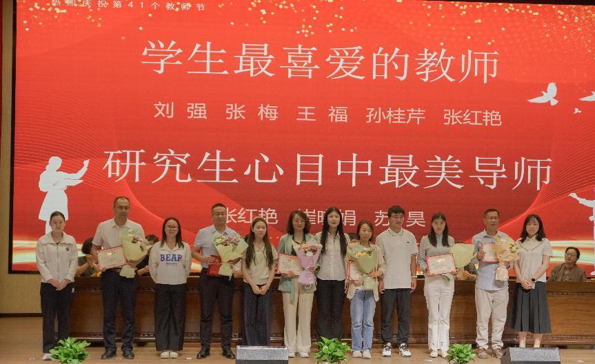 郝朝晖书记带领大家学习了习近平总书记重要指示精神,落实立德树人根本任务努力培养德智体美劳全面发展的社会主义建设者和接班人,并宣读了表彰决定。教师节庆祝大会表彰了“学生最喜爱的教师”“研究生心目中的最美导师”“同行眼中的最美教师”“机关最美教师”“三育人”工作先进个人,并进行了颁奖和赠送鲜花。强调要以习近平总书记提出的教育家精神为指引,坚守讲台,落实立德树人的根本使命。