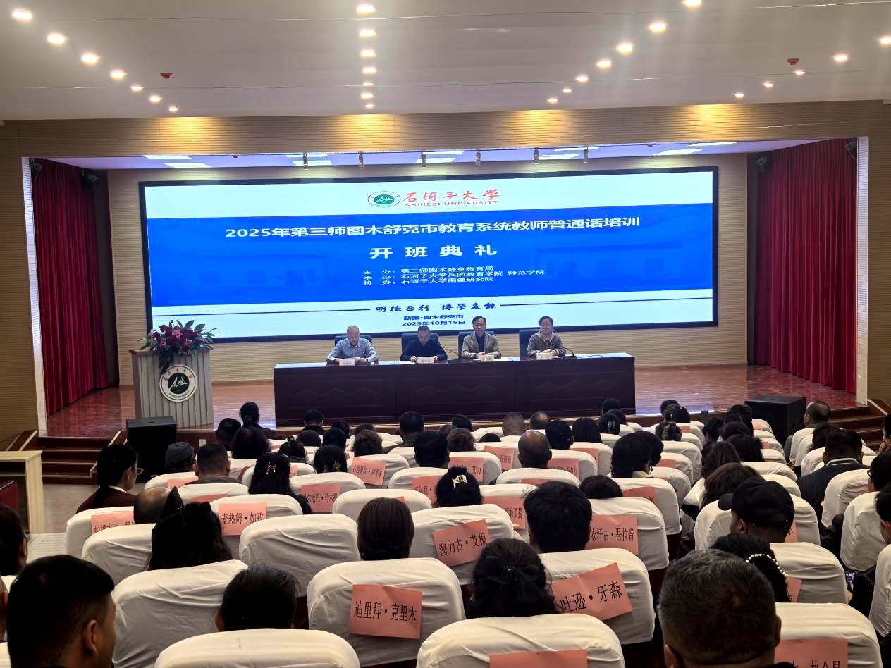 为深入学习贯彻习近平总书记关于教育的重要论述和全国教育大会上的重要讲话精神、关于语言文字工作和语言文化的重要指示批示精神,习近平总书记率中央代表团出席自治区成立70周年庆祝活动期间的重要讲话重要指示精神,10月16日,兵团教育学院、师范学院在我校南疆研究院举办2025年第三师图木舒克市教育系统教师普通话培训开班典礼。第三师图木舒克市教育局局长周京波、兵团教育学院院长童德军、培训团队及81名参训教师参加典礼。