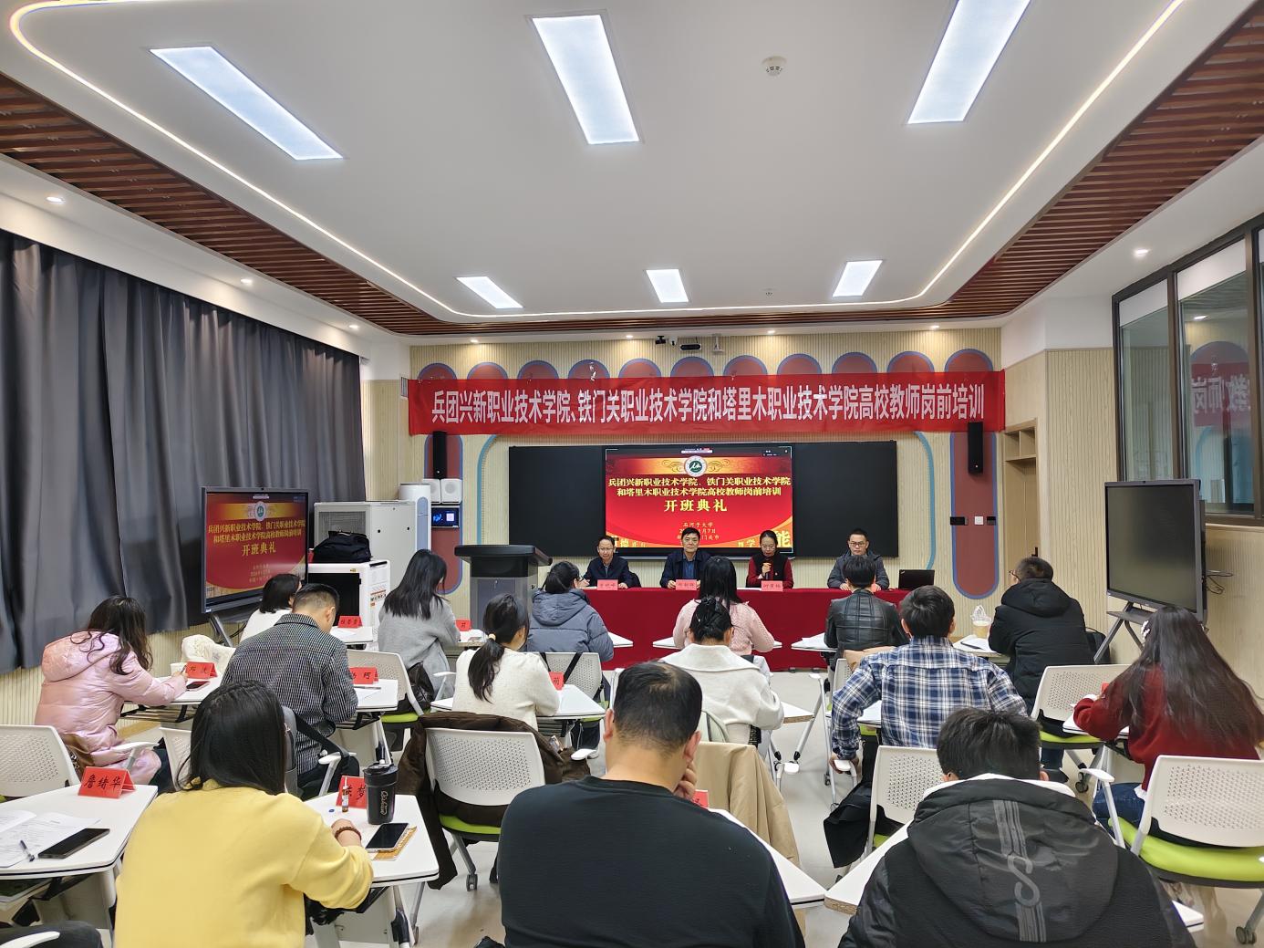 17日,兵团兴新职业技术学院、铁门关职业技术学院、塔里木职业技术学院高校教师岗前培训在铁门关职业技术学院开班。兵团教育学院党总支书记郝朝晖、铁门关职业技术学院副院长何莲梅、兵团兴新职业技术学院副院长曾晓峰、培训团队及76名参训学员参加开班典礼。