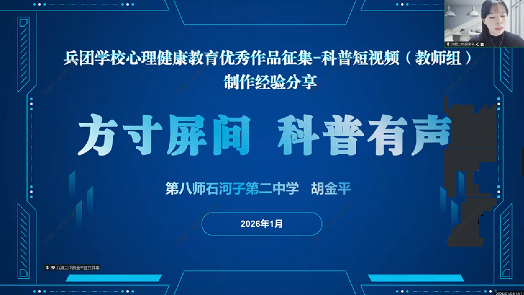为总结活动成果、推广优秀经验,兵团教育局于2026年1月8日组织召开了“兵团心理健康教育优秀作品征集评选活动经验分享会”。会议以线上形式举行,兵团教育局体卫艺处一级调研员蒙小树、兵团学生心理健康工作咨询委员会副主任委员朱海东出席会议并讲话。蒙小树调研员在讲话中强调了心理健康教育工作的重要意义,并为下一步实践创新指明方向;朱海东副主任委员则系统总结了本次活动成果,并就存在的问题与改进方向提出指导意见。分享会还特别邀请了6位获奖师生代表进行经验交流,他们围绕案例设计、视频创作、实践应用等方面,分享了宝贵的创作心得与教学反思,为与会者提供了丰富而具启发性的参考。