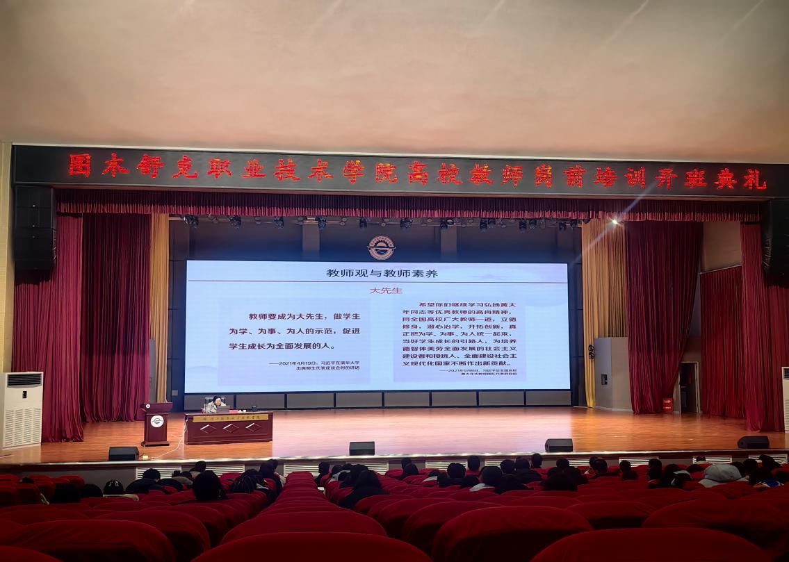 2026122日,图木舒克职业技术学院高校教师岗前培训开班典礼在第三师图木舒克职业技术学院隆重举行。图木舒克职业技术学院党委副书记、副院长胡曦,兵团教育学院副院长盛季,培训团队及104名参培学员参加了典礼。